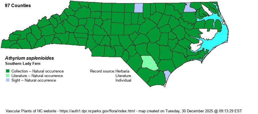 Athyrium asplenioides, Southern Lady Fern is most commonly found in lowland forests, on and near ravine slopes, and within frequently burned pinelands. Easily grown in rich, medium moisture, well-drained soil in part shade to full shade. Tolerates drier soils than many other ferns. Will tolerate full sun, however, only if soil is kept constantly moist. Shelter from wind to protect fronds from breaking. Once established, they will grow in a dense circular shuttlecock-like clump to 2-3' tall.