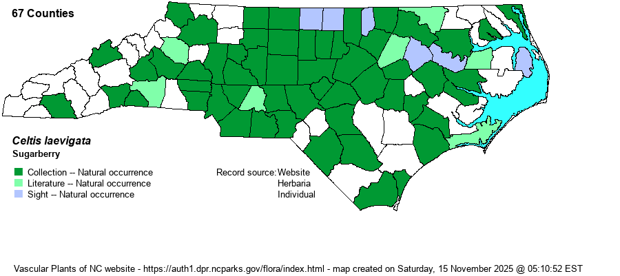Celtis laevigata, Sugarberry (aka, southern hackberry) is a medium to large tree that often attains a height of 80 to 100 ft at maturity in the wild, less in cultivated areas. Prefers medium to wet, organically rich, well-drained soils in full sun, but is tolerant of part shade. Also tolerates wind, urban pollutants and a wide range of soil conditions, including poor soils. Flowers in the spring are insignificant, and develop into edible berries by summer that are a valued resource for birds and animals.