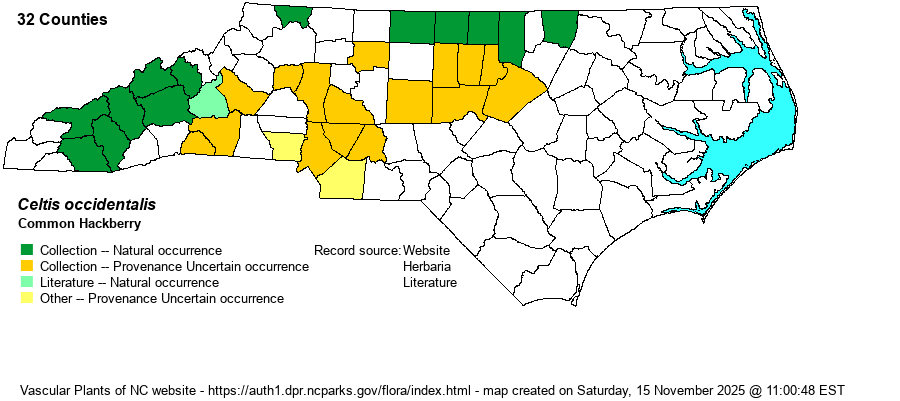 Celtis occidentalis, Hackberry is a medium to large sized tree, 40-60 ft in height with a slender trunk. In the wild under optimal conditions in the midwest (eg, it can grow to 130 ft and is moderately long lived, at 150-200 years. Hackberry grows in many different habitats, although it prefers bottomlands and soils high in limestone and is somewhat tolerant of shade, if other conditions are optimal. Does well in a range of soils, even wet, and is drought tolerant once established. Will not do well in maritime areas. It is easily identified by its cork-like bark with wart-like protuberances. It produces small fruits that turn orange-red to dark purple in the autumn, often staying on the trees for several months, and is a valuable resource for birds and animals.