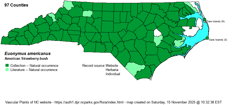 Euonymus americanus, Hearts A'busting/Strawberry Bush - The American strawberry bush is a deciduous shrub that grows 6-12 ft. tall, and found in wetland areas such as margins of swamps, shaded stream banks, and sloped wetlands. However, though it resides in moist areas, it is not a flood tolerant species; therefore, only being able to grow in moderately saturated soils. It does best in sunny sites, but will tolerate shade. Its ridged twigs become purplish when exposed to the sun. Pale green flowers with purple stamens have five, distinct clawed petals. Bright green, oval leaves become dark red in fall when bright red fruits open to reveal orange seeds, which are dispersed by animals, helping in it's propagation.