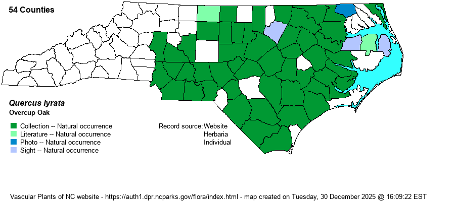 Quercus lyrata, Overcup Oak is an oak in the white oak group. The common name, overcup oak, refers to its acorns that are mostly enclosed within the acorn cap It is native to lowland wetlands areas. It is a slow-growing tree that often takes 25 to 30 years to mature/produce acorns and can reach average heights of 40-75', much higher in woodland/optimal settings. It has an estimated lifespan of 400 years. Best grown in acidic, moist to wet loams in full sun. Tolerates some part shade but not full shade.